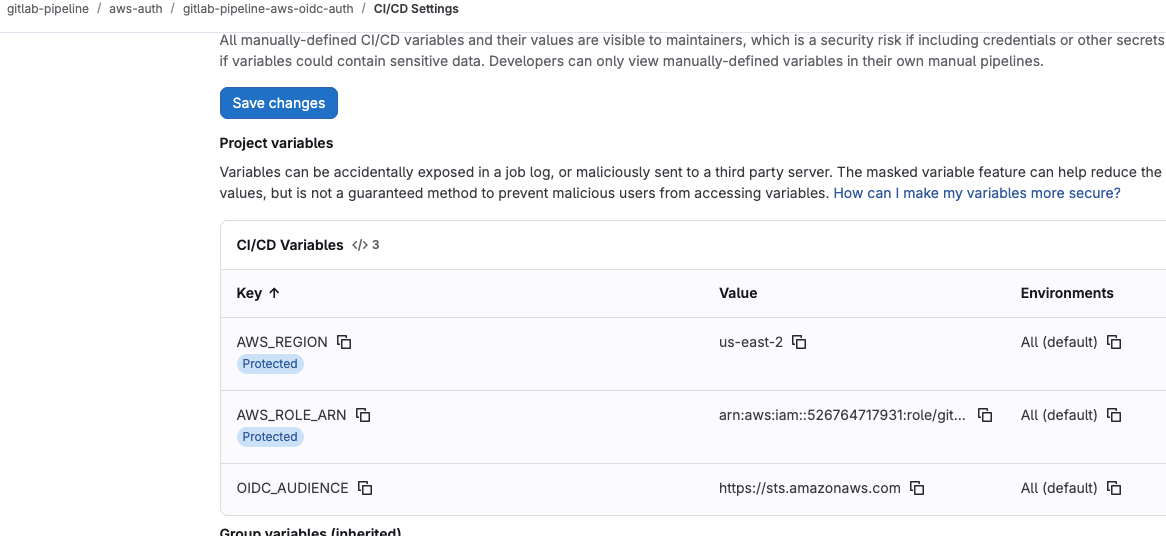 - AWS_ROLE_ARN = arn:aws:iam::xxxxxxx:role/gitlab-oidc-role-s3-readwrite (role ARN to be assumed)