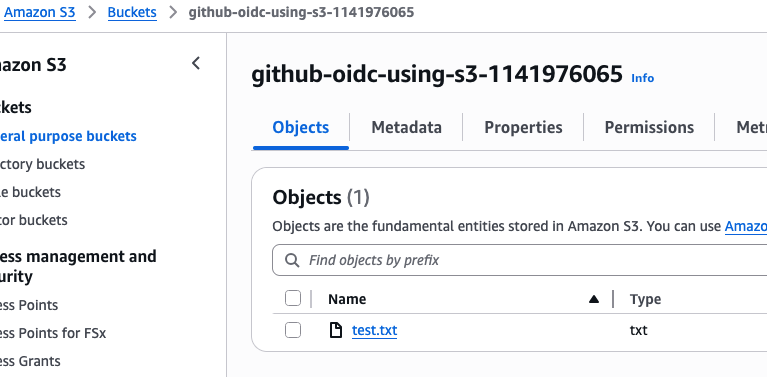 Navigating to Amazon S3 >Buckets will show the new bucket and “test.txt” content just uploaded by the GitLab job.